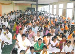 “Shashwat Yogic Kheti Abhiyan” launched at Shanti Sarovar, Hyderabad on 7.11.2010. Abhiyan moved towards Nizamabad District.in Andhra Pradesh. In Nizamabad dist. campaign started from 8.11.2010 to 30.11.2010. It has covered 36 mandals in the Nizamabad district and one division in Adilabad district. About 168 major Gram Panchayat villages are covered during this Campaign.In the photo is Ramayampet mandal where the campaign was welcomed by the MPP, AMC chairman and Surpanch. They expressed that this type of service is utmost need of the farmers since most of the farmers suicide cases are from this district. In the photo graph are MPP giving the speech, Surpanch and BK Jaya In charge of Kamareddy Centre, BK Arundati and BK Anil are on the stage.
