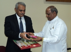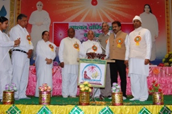 After giving a message on Sustainable Yogic Agriculture project, Co-ordinator of the Agriculture and Rural Development Wing B.K.Raju is giving a godly gift to the vice chancellor of University of Agricultural Sciences, Dr. K. Narayana Gowda.