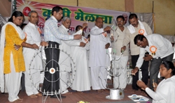 At the inauguration of the farmers' conference, lighting the candles are: Nagpur Divisional Co-ordinator of Agriculture Bro. V. Ghavte, National Co-ordinator of the Agriculture and Rural Development Wing B.K.Rajubhai, Bro. Vijay Khavas, Bro. Dilip Bhoyar, B.K.Dashrathbhai, B.K.Gangadharbhai, B.K.Ashokbhai, B.K. Nitinbhai and B.K. Sis. Rekha. About 2000 farmers are benefited by this program.
